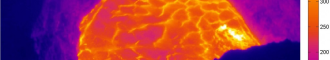 Today, a part of the overlook crater in Halema’uma’u collapsed and more fumes were visible during the event. The area that collapsed can be seen at the bottom left corner of the crater in this thermal image.